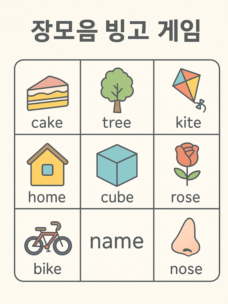준비물: 빙고판에 장모음 단어 그림(cake, tree, kite, home, cube)